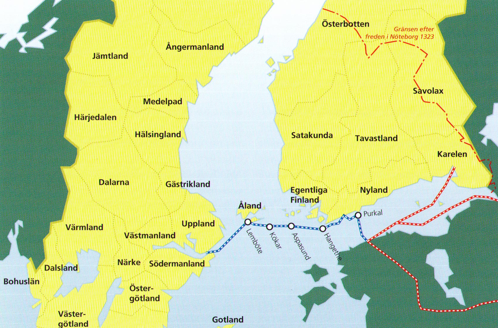 Vikingarnas östra rutt och landskapen på 1100-talet. Porkala (Purkal) utgjorde en central punkt på rutten. – Konungens kartverk 1790.