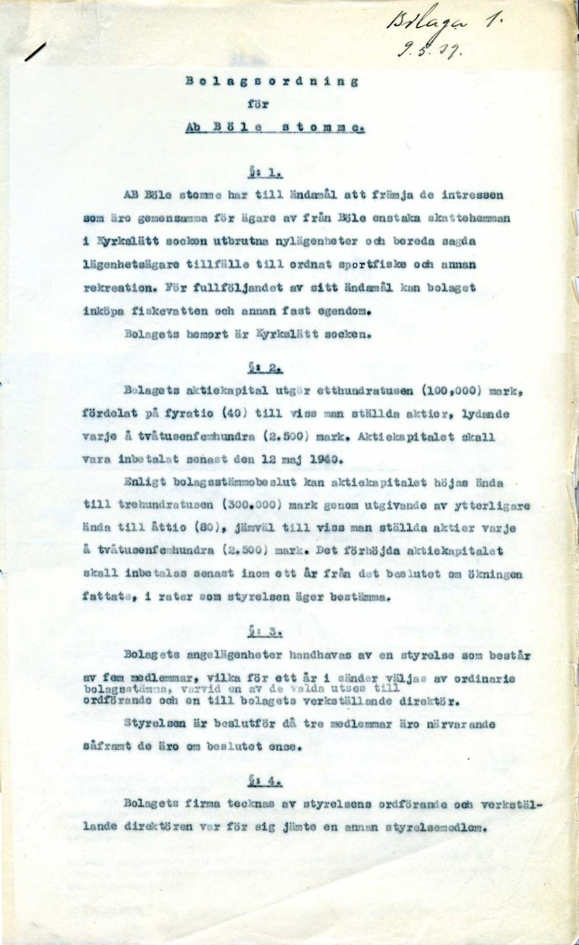 Förslag till BS bolagsordning, möte 1939-05-09, bilaga1, sida1