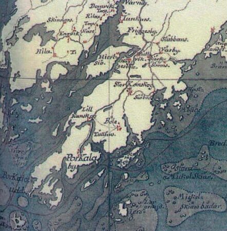 Vikingarnas östra rutt och landskapen på 1100-talet. Porkala (Purkal) utgjorde en central punkt på rutten. – Konungens kartverk 1790.